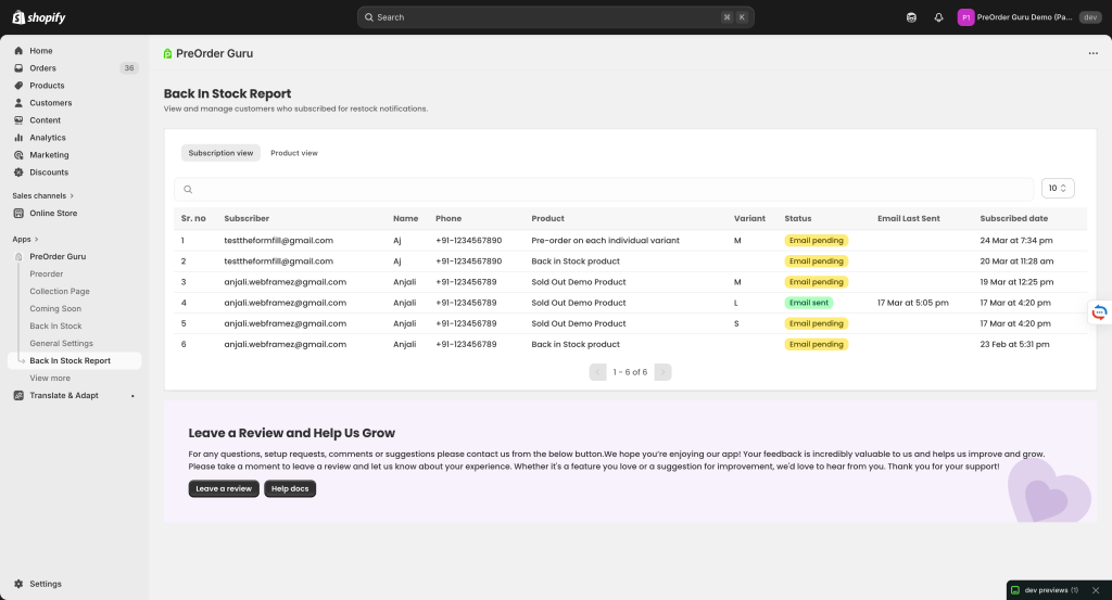 The Back In Stock Report in Shopify (via PreOrder Guru app) helps you track customers who subscribed to restock notifications for out-of-stock products.