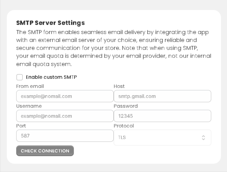 - Toggle “Enable custom SMTP”