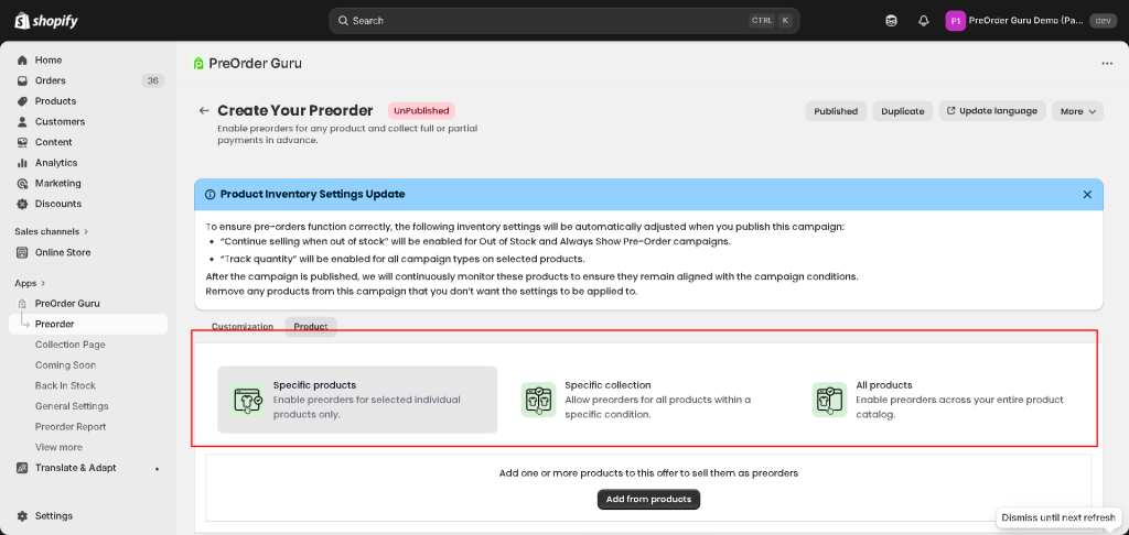 Once you are done with the customization click on the next Tab which is to choose the Products to show the pre-order button: