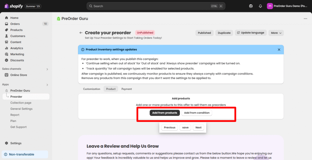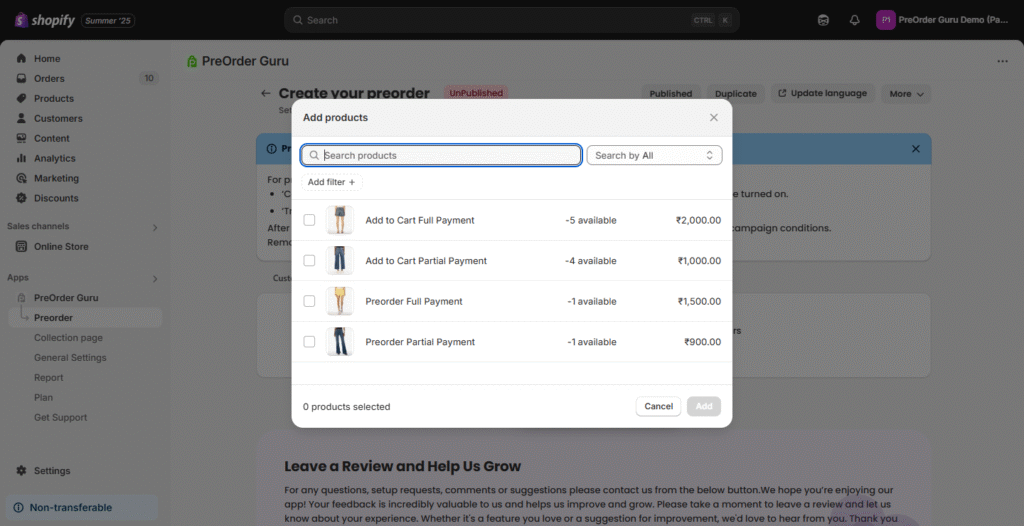 Once you are done with the customization click on the next step which is to choose the Products to show the pre order products :