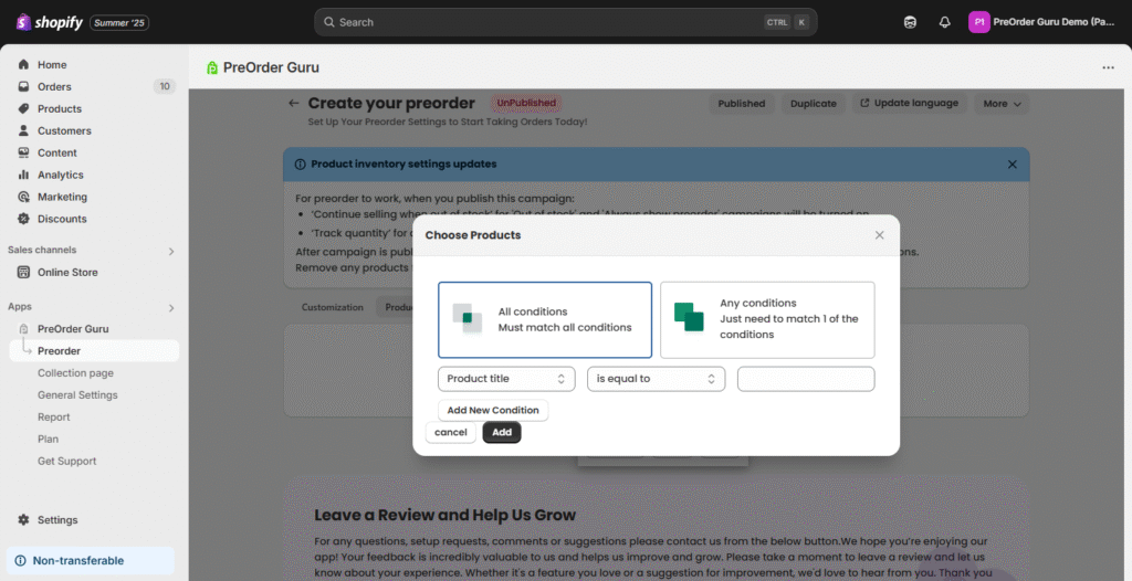 Note : If you will choose the products from conditions then the add products from the add product option will not be selected for creating preorder.
