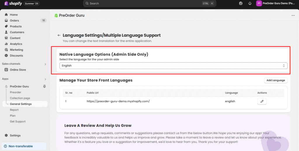 Enhance your administrative experience by selecting your native language from our comprehensive set of language options. Customizing the language settings to match your linguistic preferences will make your app interface available in your selected language. Hence, this app feature provides a better understanding of the app functionality in your language. Here are a variety of languages offered by PreOrder Guru