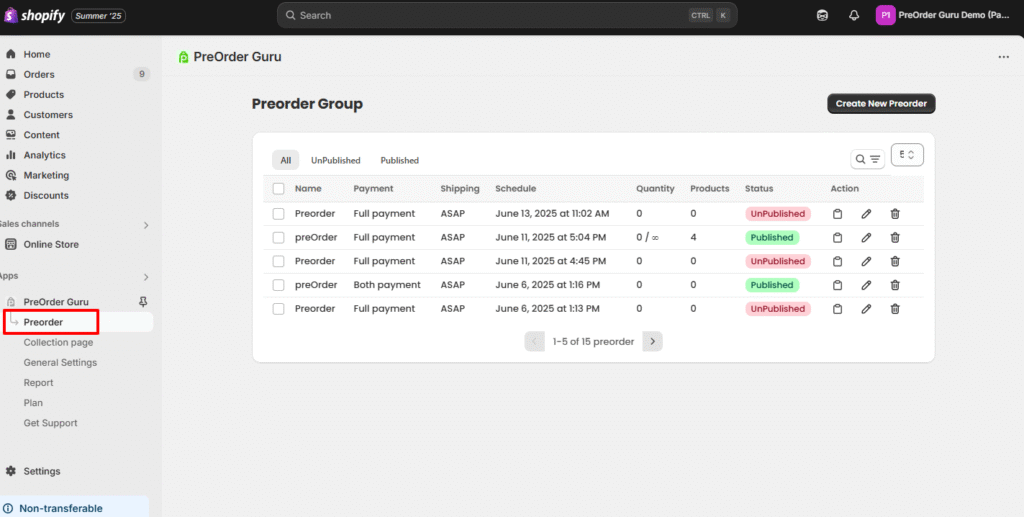 From your Shopify admin, open Apps → PreOrder Guru. On the left-hand side navigation menu of the app, click on “Preorder”.