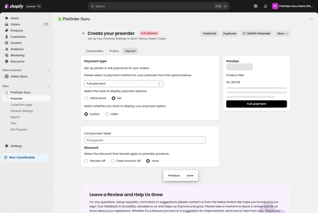 Charge customers the entire product price upfront at the time of preorder. - Partial Payment