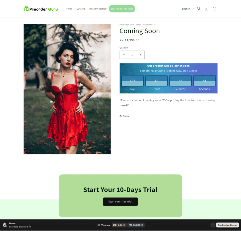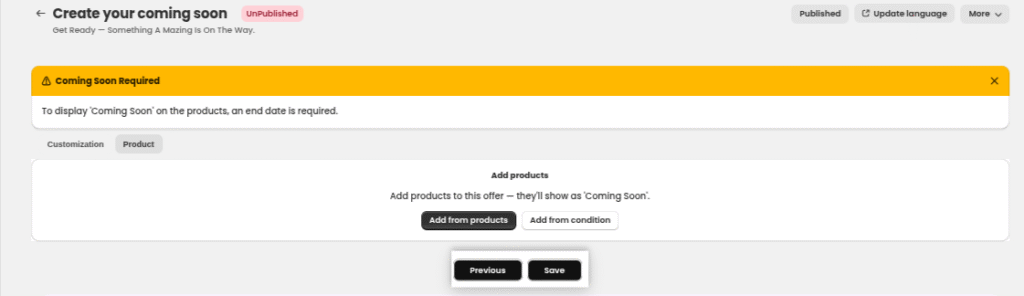 The Coming Soon feature replaces the regular Add to Cart button with a Coming Soon button provided by the app. This works independently from the Pre-order or Back In Stock features.
