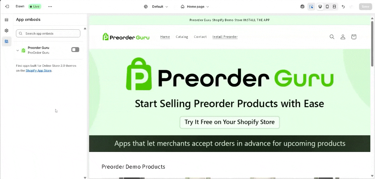 - Enable App Button: After selecting a theme from the dropdown menu, click the “Enable App” button to open the Theme Customizer in a new tab. Then, turn on the Pre-Order App toggle in App embeds.