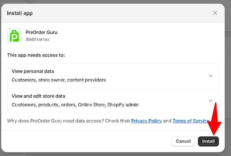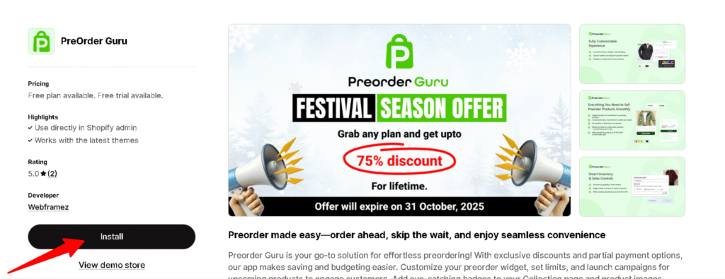 Step 01: Search for and install the PreOrder Guru app by Web Framez from the Shopify App Store.