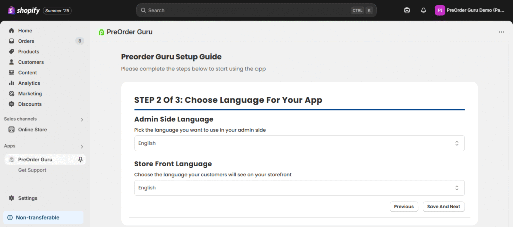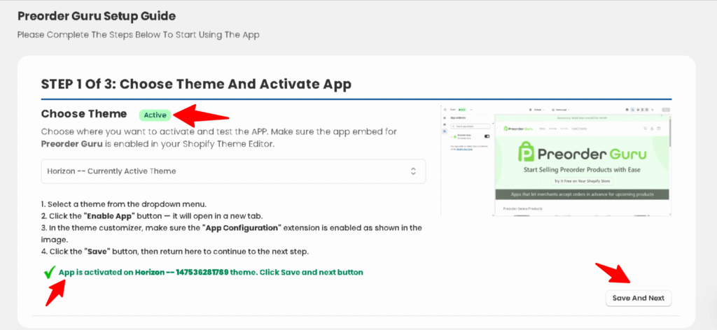 - Choose Theme: Please choose the desired theme from dropdown where you want to activate and test the PreOrder Guru app.